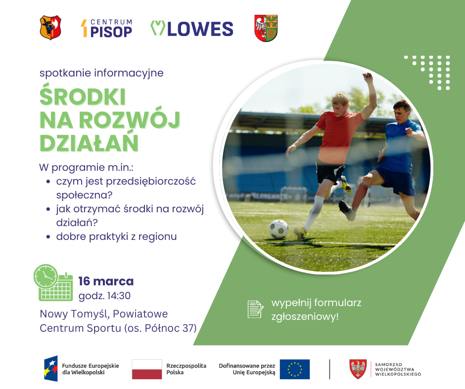 Prowadzisz lokalny klub sportowy lub organizację społeczną? Myślisz o rozwoju i zatrudnianiu nowych osób? Mamy środki na realizację twoich planów! Zapraszamy na spotkanie do Nowego Tomyśla.